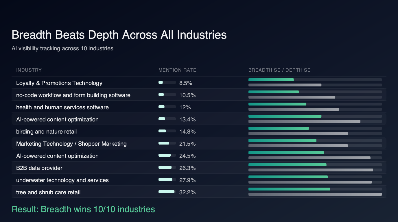 "Go wide" wins across every industry we tested. Whether your brand is mentioned 8% or 38% of the time, tracking more queries always beats running the same queries more often.